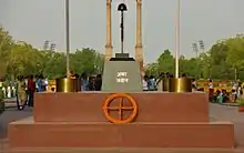 Burning in a shrine under the arch of India Gate since 1971 is the Amar Jawan Jyoti (the flame of the immortal soldier) which marks the Tomb of the Unknown Soldier. The shrine itself is a black marble cenotaph with a rifle placed on its barrel, crested by a soldier's helmet. Each face of the cenotaph has inscribed in gold the words "Amar Jawan" (Immortal Warrior) in Hindi (Devanagri script). The Prime Minister of India pays homage to the country's fallen soldiers along with the Chiefs of Staff of each arm of the Armed Forces on each Republic Day of India. | |