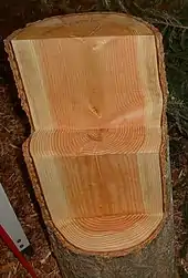 In the second chapter, "Taking Root", the embryonic root emerges through a small opening in the seed coat and through cell division, aided by plant hormones, it grows downward. Water and nutrients enter the root by osmosis and are transported to the seedling. A symbiotic relationship develops between the roots and the truffles. The roots give its extra sugars to the truffles, which it uses for energy, and the truffles assist the roots' uptake of water and nutrients. From excess starches and nutrients gathered by the root, a stem similar to the root but surrounded with thin, grayish bark, grows upwards. As the starch reserves are exhausted, its first needles sprout and photosynthesis begins. The tree anchors itself with a deep taproot and a web of roots begin to grow laterally. Some roots develop symbiotic relationships with near-by red alders which excel at nitrogen-fixation but lack the storage capacity that the Douglas-fir can offer. In early April of every year, a new layer grows between the bark and wood. As this new layer takes over transportation of fluids throughout the tree, last year's layer of cells die and form a ring in the wood.