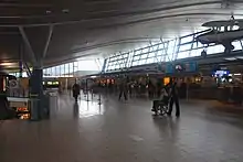 The fourth and current domestic terminal was opened on 15 November 1994. With 15,000 square metres (160,000 sq ft) of floor space it had seven gates, of which five had jetbridges. The two remaining gates were fitted with jetbridges in July 2012.[47] Værnes became the first airport in the Nordic Countries with a train station in the terminal, when Trondheim Airport Station opened. In March 1996, the old terminal was named Terminal B and all international flights were moved there. A new taxiway, which extended the full length of the runway, was opened in 1999, after more artificial land has been created and a second tunnel built for the highway and railway.[48]