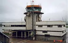 The airport also has a diagonal runway, which runs 14/32, roughly northwest–southeast. It is 1,035 metres (3,396 ft) long, plus end section of 293 metres (961 ft) on Runway 14 and 126 metres (413 ft) on Runway 32. The runway is closed for traffic, in part because of bad asphalt quality.[18] The current control tower is 55 metres (180 ft) tall and dates from 2005.[19]