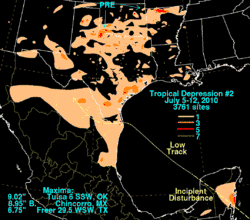 Tropical Depression Two was a short-lived tropical cyclone that impacted portions of Texas and Mexico during the highly active 2010 Atlantic hurricane season. It formed from a tropical wave that emerged off the western coast of Africa and crossed the Atlantic Ocean without any development. Upon entering the western Gulf of Mexico, the depression encountered a conducive environment for tropical cyclone development, and was designated Tropical Depression Two at 0600 UTC on July 8. Intensification into a tropical storm was initially anticipated by the National Hurricane Center (NHC), but due to its proximity to land, the depression failed to attain the status. It made landfall on South Padre Island, Texas before degenerating into a remnant low on July 9, and dissipating the following day. Due to the system's weak intensity, there were no reports of damage inflicted by winds across Texas or Mexico, although the cyclone did bring minimal rainfall totals to northern Mexico, an area severely affected by Hurricane Alex just one week previous.