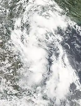 The origins of Tropical Depression Two can be traced back to a disorganized tropical wave that was first noted by the NHC on June 24 as it moved off the western coast of Africa, and into the Atlantic Ocean. Moving towards the west, the wave showed no signs of organization until July 3 as it entered the western Caribbean Sea.[1] During the 24 hours that followed, it continued to coalesce, and the NHC subsequently increased the disturbance's chance of developing into a tropical cyclone.[2] A defined surface circulation did not form as a result of the wave's movement over the Yucatan Peninsula, and the system lost organization.[1][3][4] The system remained disorganized as it traversed the peninsula and eventually emerged into the Gulf of Mexico on July 7.[5] Situated over water once more, the wave was able to gradually develop as it moved in a northwesterly direction. Following a reconnaissance mission, the NHC noted in their Tropical Weather Outlook that there was a high chance of the system developing into a tropical cyclone within the next 48 hours.[6]