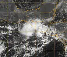 The storm drifted southward and later eastward due to northerly flow behind a mid- to upper-level trough in the Gulf of Mexico. With well-defined outflow and warm sea surface temperatures, Barbara became better organized as tightly curved bands of convection developed near the center.[5] However, by May 31, increased wind shear and less inflow deteriorated the definition of the circulation, causing the storm to weaken.[6] By later that day, the system contained a very small circulation within a large-scale trough,[7] and early on June 1 it was downgraded to tropical depression status.[8] Later in the day, convective banding features re-developed, and after a QuikSCAT overpass indicated a well-defined circulation in the system, Barbara was again upgraded to tropical storm status.[9] The storm reached peak winds of 50 mph (85 km/h) and turned to the northeast as it tracked through a break in a ridge extending from the southwest Gulf of Mexico.[10] Banding features continued to organize, and shortly before moving ashore a low-level eye feature developed.[11] At about 1300 UTC on June 2, Barbara made landfall just west of the border between Mexico and Guatemala. The center quickly deteriorated to tropical depression status over the mountainous terrain of extreme southeastern Chiapas, and Barbara dissipated within twelve hours of moving ashore.[1]
