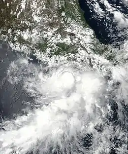 In Oaxaca, severe flooding killed one individual. Fishermen recovered the body of a 29-year-old man about 10 mi (20 km) off the coast after he was dragged away by flood waters and drowned.[24] The proximity of the storm prompted the closure of the ports of Huatulco, Puerto Ángel, and Puerto Escondido as well as the suspension of fishing operations.[25] Multiple landslides also occurred as a result of the extreme rainfall.[26][27] Only minor damage was reported in Guerrero. In the Costa Chica region, the storm damaged several palapas on a beach and the fishing equipment of at least 80 families, preventing them from working.[28] In the municipalities of Tecpan de Galeana, Zihuatanejo and Petatlán, 42 homes were inundated by flood waters. A total of 138 trees were downed in Acapulco and several other municipalities. In Acapulco, a hospital sustained damage to its windows and four injuries were reported. Additionally, 32 neighborhoods lost power, nine houses lost their roofs, and 11 roads collapsed.[29][30] In Tehuacán, Puebla, homes and businesses were flooded, multiple cars were stranded, and several trees fell. Nearby, a state highway and a bridge collapsed, cutting off several towns in the area.[31]