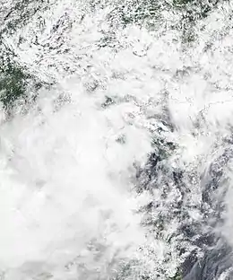 On the following day, July 31, the Japan Meteorological Agency (JMA) designated the invest as a tropical depression.[6] In a favorable environment of low vertical shear, excellent equatorial outflow and 31 °C sea surface temperatures,[2] the depression continued to organize, and by the next day, the JMA upgraded depression to a tropical storm, naming it Sinlaku.[7] The JTWC would later follow suit, upgrading the monsoon storm to tropical storm status.[8] Sinlaku would later not intensify further, although the JMA said the storm's pressure lowered to 992 hPa (29.29 inHg).[9] The storm would later make landfall on northern Vietnam,[10] and both agencies issued final advisories on Sinlaku.[11][12]