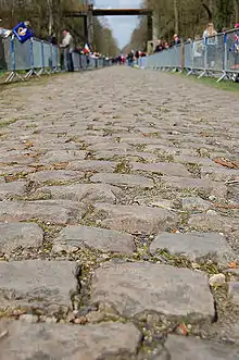 It is also the only site of the race where guard rails are placed, as the road is narrow and fans gather in large numbers to see the race.[5] In the earlier years of the section's inclusion, riders were often able to avoid riding on the cobbles by using the verges on the edge of the road - Gouvenou claimed that riders only had to ride 400 of the secteur's 2300 metres on the cobblestones - however in the 1990s the barriers were introduced to prevent crashes. According to Doulcier, over 10,000 fans watch the race on the Arenberg every year.[2]
