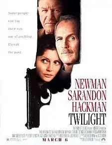 Twilight is a 1998 American neo-noir[2] thriller film directed by Robert Benton, written by Benton and Richard Russo, and starring Paul Newman, Susan Sarandon, Gene Hackman, Reese Witherspoon, Stockard Channing, and James Garner. The film's original score was composed by Elmer Bernstein. It received mixed reviews from critics and was a box office bomb, grossing $15.1 million against its $20 million budget.