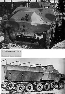The Type 1 Ho-Ha had a pair of road wheels in front, supported by a pair of short caterpillar tracks to the rear.[1] It was equipped with a tow coupling in the front and a towing hitch at the rear to haul artillery or a supply trailer. The maximum armor thickness was 8 mm with sloping armor plates. As with the Type 1 Ho-Ki, the hull was welded construction and it was "open-topped".[6]