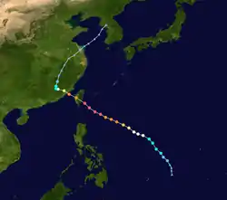 Typhoon Bilis, known in the Philippines as Typhoon Isang, was the strongest tropical cyclone in the western Pacific during 2000 and wrought considerable damage in Taiwan and China in August of that year. The tenth named storm of the season, Bilis originated from an area of disturbed weather that developed into a tropical depression southeast of Guam on August 18. Situated within an environment highly conductive for continued tropical development, the depression intensified into a tropical storm a day after formation; Bilis was upgraded to typhoon status on August 20 as it maintained a northwest course. Without significant inhibiting factors, the typhoon reached peak intensity with maximum sustained winds of 205 km/h (125 mph) and a minimum barometric pressure of 920 mbar (hPa; 27.17 inHg). At the same intensity Bilis made landfall on Taiwan the following day. Despite its short stint over land, Bilis was greatly weakened, and made a brief track over the Taiwan Strait before its final landfall on China's Fujian Province early the next day. Moving inland into Mainland China, Bilis quickly weakened, and was only a tropical depression later that day; the depression diffused into a remnant low on August 25. These remnants tracked northeast across the Yellow Sea before dissipating in the Korean Peninsula on August 27.