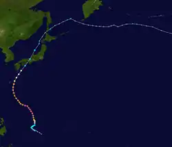 Dianmu formed on June 13 and moved west-northwest where it rapidly strengthened to typhoon status on June 16. Dianmu then strengthened to a 285 km/h (180 mph) typhoon, making it one of nine typhoons to reach that intensity since 1990 and equaled its power with Typhoon Chaba as the strongest typhoons of the 2004 season. After reaching peak intensity, Dianmu turned northwest before skirting the minor Japanese islands and making landfall in Japan as a tropical storm. Dianmu then became extratropical on June 21.[1]