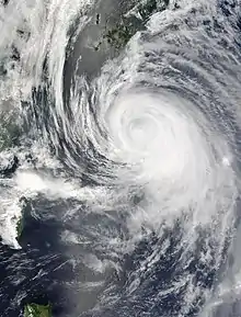 In mainland Japan, 130 flights and passenger rail service was canceled, many homes were evacuated, and schools were closed.[9] In South Korea, meteorologists at the Daegu Meteorological Administration and the government of South Korea issued torrential rain advisories as the outer rain bands of the typhoon was forecast to produce heavy rainfall. In addition, internal flights in South Korea were canceled.[10]