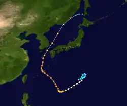 Forming from a tropical disturbance near the Mariana Islands, Emma churned southwest before gaining typhoon status on September 3. Emma then recurved after reaching Category 3 status. Moving west-northwest, Emma reached a peak intensity of 155 mph (249 km/h) as it bypassed Okinawa. Emma then brushed South Korea and Kyūshū as a strong Category 3 typhoon before swinging to the northeast and hitting China and the far eastern Soviet Union.[1]