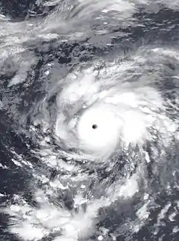 Late on July 13, a tropical depression developed near the Marshall Islands northeast of Kwajalein Atoll.[1][2] The cyclone quickly strengthened into Tropical Storm Fengshen just six hours after forming.[1] On July 14, the Joint Typhoon Warning Center (JTWC)[nb 2] initiated warnings on Fengshen just two hours after first monitoring the disturbance.[2] By that time, the system consisted of a distinct circulation with developing convection, located in an area of weak wind shear.[4] The storm initially moved northwestward, emerging from the monsoon trough as a small cyclone. Quick intensification followed, and an upper-level low to the northwest assisted in providing outflow.[2] After a 13 km (8 mi) wide eye developed,[4] the Japan Meteorological Agency (JMA)[nb 3] upgraded Fengshen to a typhoon on July 15 to the southwest of Wake Island;[1] the JTWC also upgraded the storm the same day.[2]