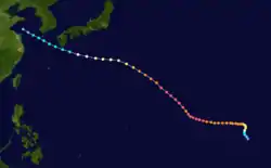 Typhoon Fengshen was the strongest storm of the 2002 Pacific typhoon season.[1] It developed on July 13 from the monsoon trough near the Marshall Islands, and quickly intensified due to its small size. By July 15, Fengshen attained typhoon status, and after initially moving to the north, it turned toward the northwest. On July 18, the typhoon reached its peak intensity of 185 km/h (115 mph 10‑minute winds), according to the Japan Meteorological Agency. The Joint Typhoon Warning Center estimated peak winds of 270 km/h (165 mph 1‑minute winds), and the agency estimated that Fengshen was a super typhoon for five days. This broke the record for longest duration at that intensity, previously set by Typhoon Joan in 1997, and which was later tied by Typhoon Ioke in 2006.