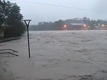 Typhoon Jangmi brought strong winds and heavy rainfall to Okinawa, peaking at 162 in (4,100 mm) to the islands on September 27–29.[16] Ishigaki Island sustained the most severe damage after a dike collapsed, flooding the surrounding areas.[17] Much of the prefecture was left without power as winds gusted to 110 km/h (70 mph).[18] Throughout the prefecture, four people were killed and six others were injured, two of whom sustained severe injuries.[17][19][20] Damage from the storm amounted to 65.2 million yen (US$746,670).[17] By October 1, the remnants of Jangmi brought heavy rains and strong winds to Kyūshū. The highest rainfall total was measured in Satsumakashiwabaru, in the Kagoshima Prefecture, at 380 mm (15 in).[16] In the prefecture, these rains triggered 42 landslides and flooded seven homes, three of which were left with severe damage. A total of 334 hectares of farmland was damaged by Jangmi, leaving 15.4 million yen (US$176,360) in losses.[21] In Miyazaki Prefecture, one person was injured and three homes were damaged after a hillside collapsed.[22]