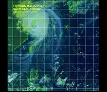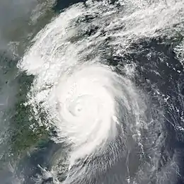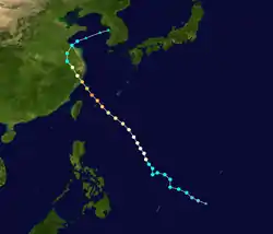 Typhoon Khanun, known in the Philippines as Typhoon Kiko, was the strongest tropical cyclone to make landfall on Zhejiang Province since Wanda in 1956. Khanun developed from an area of convection east-southeast of Yap on September 5, thereafter tracking northwestward. The precursor reached tropical storm status on September 7 and typhoon intensity the next day. The tropical cyclone reached its peak intensity on September 10 with winds estimated at 155 km/h (100 mph) and a minimum barometric pressure of 945 mbar (hPa; 27.91 inHg).[nb 1] After weakening slightly, Khanun moved ashore Zhejiang Province the next day, weakening further as it tracked over land. After recurving into the Yellow Sea on September 12, Khanun became extratropical; these remnants continued to track into the open North Pacific before they were last noted on September 16.[1][nb 2][nb 3]
