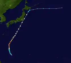 Several hours after attaining peak intensity on July 5, a mid-level trough caused convection around the center of Kirogi to weaken and the eye became cloud-filled. Later in the day, most of the convective bands were confined to the eastern periphery of the system.[1] Around this time, the storm took a northeasterly track, which it maintained for several days.[2] Increasing in forward motion, the storm began to weaken; however, it also grew in size. By July 6, the storm had a gale-diameter of 925 km (575 mi).[1] Gradual weakening took place as Kirogi tracked towards Japan, with both the JTWC and JMA reporting sustained winds at 140 km/h (85 mph) by July 7.[2][3] Early on July 8, the storm brushed the eastern coast of Japan near Chōshi, Chiba with winds of 130 km/h (80 mph 10-minute sustained).[1][2] Several hours later, the typhoon weakened to a severe tropical storm before transitioning into an extratropical cyclone near the southeast coast of Hokkaido. By this time, the storm took a sharp eastward turn and briefly slowed before re-accelerating. The remnants of the storm persisted until July 10, at which time it dissipated to the southwest of the Aleutian Islands.[2]
