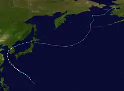 The Japan Meteorological Agency's Regional Specialized Meteorological Center in Tokyo, Japan uses the Typhoon Committees Tropical Cyclone Intensity Scale which is based on 10-minute sustained winds for its tropical cyclone tracking information, while the Joint Typhoon Warning Center uses 1-minute sustained winds.[5] The conversion factor between the two is 1.14.[6] The JMA's peak intensity for Kompasu was 150 km/h, (90 mph) 10-minute sustained, or 170 km/h, (105 mph) 1-minute sustained.[6] The JTWC's peak intensity for Kompasu was 185 km/h, (115 mph) 1-minute sustained, or 165 km/h (100 mph) 10-minute sustained.[6][7]