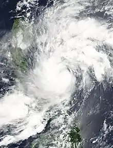 On April 28, the Joint Typhoon Warning Center reported that an area of convection had persisted about 230 km (140 mi) to the northeast of Puerto Real in the Philippines.[1] The disturbance had deep convection which was flaring in association with a mid level circulation center and was in an area of low vertical wind shear.[1] However the disturbance then dissipated later that day.[2] The disturbance then regenerated early on April 30, with a broad low level circulation center and was nestled within the islands of southern Luzon. An upper level anticyclone just to the northwest was enhancing pole ward outflow.[3] During that day the disturbance developed further with improved convective banding in the northern quadrant, however interaction with land was a major hindrance.[4] Early on May 1, the disturbance was designated as a Tropical Depression by the Philippine Atmospheric, Geophysical and Astronomical Services Administration (PAGASA) and the Japan Meteorological Agency, with PAGASA assigning the name Dante to the depression.[5][6] Later that day PAGASA declared that Dante had made landfall on the Bicol Region in Southeastern Luzon.[7] Early the next day the JTWC issued a Tropical Cyclone Formation Alert on the disturbance as whilst the low level circulation center had remained slow moving over southeastern Luzon the disturbance had a good outflow with convection starting to improve in terms of organization.[8] Later that morning the JTWC designated the disturbance as Tropical Depression 01W.[9] The Depression was being moved by the reverse oriented monsoon trough with a well formed low level circulation center with deep convective banding wrapping around the northern quadrant despite being close to land.[9][10]
