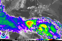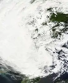 Lionrock interacted with a low pressure area over China to drop heavy rainfall in North Korea, mostly in North Hamgyong Province,[16] considered by the state media Korean Central News Agency to be the "heaviest downpour since 1945".[29] Over a two-day period, Kyonghung County recorded 320 mm (13 in) of rainfall. This caused flooding along the Tumen River and its tributaries,[16] inundating about 16,000 ha (40,000 acres) of farmlands just weeks ahead of the harvest,[30] of which 10,145 ha (25,070 acres) were wrecked.[16]
