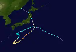 Lionrock's track was unusual due to the fact that the storm approached Japan from the southeast and made landfall along the east coast of the country. Most typhoons that hit Japan approach from the south or the southwest before moving northward across the archipelago.[9] In fact, the only other storm to take a similar track was Typhoon Mac in 1989, which also approached from the southeast and struck Japan's Kantō region along its east coast.[10]