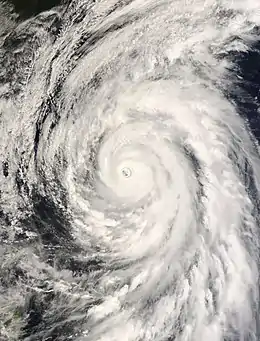 Rammasun continued to intensify and was designated as a severe tropical storm late on May 8.[10] The next day both the JMA and the JTWC reported that Rammasun had intensified into a typhoon.[11][12] Later that day the JTWC reported that the typhoon had rapidly intensified within the last six hours and had become a Category 3 typhoon on the Saffir–Simpson hurricane wind scale.[13] At the same time the JMA were reporting that Rammasun had winds of 150 km/h (90 mph).[14] The typhoon then continued to intensify quickly with the JMA reporting that Rammasun had winds of 160 km/h (100 mph), the JTWC then reported that Rammasun had become a Category 4 typhoon with winds of 225 km/h (140 mph).[15][16] Later that day both the JMA and the JTWC reported that the typhoon had reached its peak winds. The JMA reported peak winds of 195 km/h (120 mph) whilst the JTWC reported that Rammasun had peak winds of 250 km/h (155 mph), making it a category 4 super typhoon.[17][18] Typhoon Rammasun's minimum pressure was officially estimated at 915 hPa which tied with Intense Tropical Cyclone Hondo as second strongest storm of 2008.[18][19]