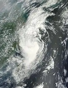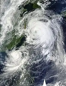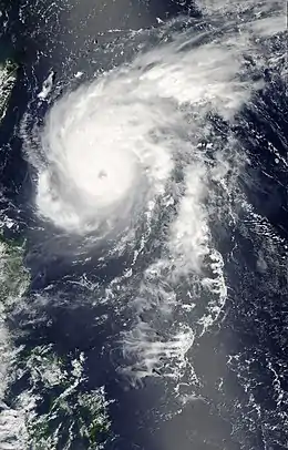 Later that day, animated enhanced infrared satellite imagery depicted that the organization has been able to consolidate with convection beginning to wrap into the LLCC, as the LLCC was moving away from land.[25] While tracking west-southwestward at nearly 07 knots (13 km/h; 8.1 mph), convection started to wrap anew into the LLCC. A microwave eye feature was also observed. Upper level analysis indicated a weak point source anticyclone that continued providing a radial venting mechanism and low vertical wind shear environment. After developing an eye, Tembin rapidly intensified into a category 3 typhoon, before gradually weakening due to an easterly wind shear from Bolaven, which caused the LLCC to become slightly exposed, associated with a few burst of convection, and made its closest approach to Taiwan on 17:30(UTC) as a tropical storm.[26][27][28]