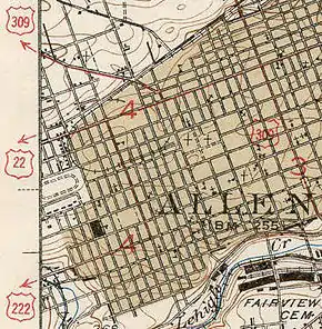With the creation of the U.S. Highway System in 1926, the road between Reading and Lancaster was designated US 222 while the road between Reading and Allentown was part of US 22, which ran along what was designated the William Penn Highway in 1916 and PA 3 in 1924.[12][81][82] In the late 1920s, US 222 briefly ran concurrent with PA 41 and PA 240 at different times.[83][84] PA 42 originally ran north–south through Reading starting in 1927. By 1930, the concurrent state route designations were removed from US 222 and US 22. US 222 entered Reading along with PA 73 along Lancaster Avenue and Bingaman Street before turning north on 9th Street along with PA 83 to end at US 22 and US 422 at Penn Street. US 22 continued north on 9th Street out of Reading and continued along Kutztown Road through Temple toward Allentown. US 120 began at US 222 at Bingaman Street and headed north on 4th Street and Center Street out of Reading.[11][85] In 1931, US 22 was moved to a more direct alignment between Harrisburg and Allentown, and US 222 was extended north along the former alignment between Reading and Allentown.[12] US 222 was shifted to use Lancaster Avenue, Bingaman Street, and 5th Street and 5th Street Highway through the Reading area in the 1930s, running concurrent with US 122 through downtown Reading.[14][86] The US 122 and PA 73 concurrencies were removed by 1966.[87] In 1975, US 222 was rerouted to bypass Reading on the West Shore Bypass and the Warren Street Bypass, with the former alignment through the city becoming US 222 Bus.[55][56] In 1998, US 222 Bus. was extended north to its current terminus following the rerouting of US 222 to a new outer bypass of Reading.[43][67][88] The business route was extended south to its current endpoint in 2004 with the completion of the US 222 freeway south of Reading to Mohnton.[43][67][89]