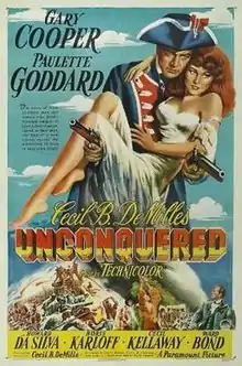 Unconquered is a 1947 American historical epic adventure film produced and directed by Cecil B. DeMille and starring Gary Cooper and Paulette Goddard. The supporting cast features Boris Karloff, Cecil Kellaway, Ward Bond, Howard Da Silva, Katherine DeMille (the director's daughter), C. Aubrey Smith and Mike Mazurki. Released by Paramount Pictures, the film depicts the violent struggles between American colonists and Native Americans on the western frontier in the mid-18th century during the 1763 Pontiac's Rebellion, primarily around Fort Pitt (modern-day Pittsburgh). The film is characterized by DeMille's lavish style, including colourful costumes and sets, thousands of extras, violence, and sensationalism.