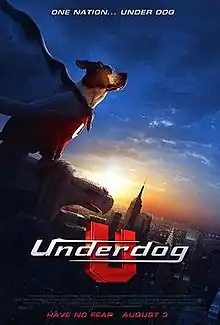 Underdog is a 2007 American superhero action comedy film based on the 1960s cartoon series of the same name. Directed by Frederik Du Chau and written by Joe Piscatella, Adam Rifkin, and Craig A. Williams, the film stars Jim Belushi, Peter Dinklage, John Slattery, and Patrick Warburton with the voice talents of Jason Lee, Amy Adams, and Brad Garrett. Unlike the TV series, the Underdog character is portrayed as a regular dog rather than an anthropomorphic one. Underdog, voiced by Jason Lee, was played by a lemon beagle named Leo sporting a red sweater and a blue cape. The film grossed $65.3 million worldwide and has a 16% approval rating on Rotten Tomatoes, which called it "mostly forgettable".