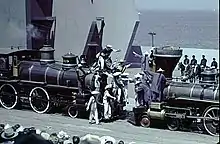 In 1975, the National Park Service embarked on a project to reproduce the Union Pacific No. 119 and Central Pacific Jupiter exactly as they appeared in 1869. Since the original drawings had not survived, the Park Service initially approached Walt Disney Studios, which had previously built two steam engines from scratch for their Disneyland park's railroad, for the project. Disney declined, but recommended the O'Connor Engineering Laboratories in Costa Mesa, California, for the task. Noted railroad historian and steam engine owner Gerald M. Best served as engineering consultant to the Park Service for the project. Over 700 detailed engineering drawings were recreated, based almost entirely on the photographs taken of the engines during the ceremony. Disney animator and steam engine owner Ward Kimball did color matching and original artwork for the Jupiter and No. 119.[2][3][4]