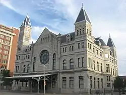 The Union Station of Louisville, Kentucky is a historic railroad station that serves as offices for the Transit Authority of River City (TARC), as it has since mid-April 1980 after receiving a year-long restoration costing approximately $2 million. It was one of at least five union stations in Kentucky, amongst others located in Lexington, Covington, Paducah and Owensboro. It was one of three stations serving Louisville, the others being Central Station and Southern Railway Station. It superceded previous, smaller, railroad depots located in Louisville, most notably one located at Tenth and Maple in 1868-1869, and another L&N station built in 1858. The station was formally opened on September 7, 1891 by the Louisville and Nashville Railroad. There was a claim made at the time that it was the largest railroad station in the Southern United States, covering forty acres (16 ha).[2] The other major station in Louisville was Central Station, serving the Baltimore and Ohio, the Illinois Central and other railroads.