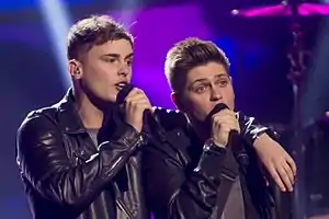 Joe and Jake took part in technical rehearsals on 7 and 8 May, followed by dress rehearsals on 11, 13 and 14 May.[23] This included the semi-final jury show on 11 May where an extended clip of the British performance was filmed for broadcast during the live show on 12 May and the jury final on 13 May where the professional juries of each country watched and voted on the competing entries.[24] During the opening ceremony festivities that took place on 8 May, Joe and Jake took part in a draw to determine in which half of the final the British entry would be performed. United Kingdom was drawn to compete in the second half.[25] Following the conclusion of the second semi-final, the shows' producers decided upon the running order of the final. The running order for the semi-finals and final was decided by the shows' producers rather than through another draw, so that similar songs were not placed next to each other. United Kingdom was subsequently placed to perform in position 25, following the entry from Austria and before the entry from Armenia.[26]
