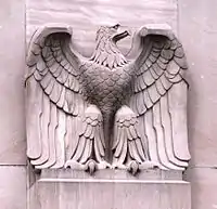 The building was constructed using six different types of Tennessee marble,[1] a locally quarried stone used in monumental buildings throughout the United States.[4] The exterior, clad mostly in Tennessee "pink" marble, includes a facade of imposing columns, Moderne-style cylindrical molding along the roofline,[1] and four eagle statues carved by Candoro Marble Works sculptor Albert Milani (1892–1972).[4] The entrances are located at the corners of the building, while the front of the building contains aluminum casement windows and a sunken courtyard. This courtyard is masked by a retaining wall built of red Tennessee marble, and topped with Art Deco light fixtures.[1]