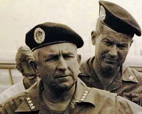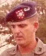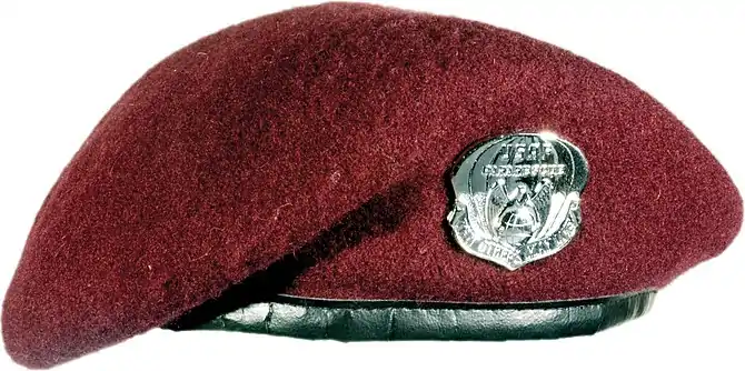 Other beret accouterments began to appear in the 1960s and 70s, particularly between 1973 and 1979 when the Department of the Army's (DA) morale-enhancing order was in effect and various colored berets began to be worn my numerous units and branches of the Army.[20][21][28] Historical photographs from the 1960s through the 1970s show soldiers assigned to Long-Range Reconnaissance and Patrol units wearing black berets with a wide variety of patches, tabs, and devices that were used as their beret flash (see Example 1).[28] Also during this time-period, some paratroopers and rangers assigned to certain training units would wear their Airborne Tab or Ranger Tab on a black beret above their DUI, Parachutist Badge, or rank insignia (see Example 2).[28][29] In 1975, the Army authorized its ranger units to wear the black beret with some of these units continuing to attach their Ranger Tab to their beret by sewing it on top of their new organization beret flash.[28][30] In 1973, Army leaders authorized the wear of the maroon beret by airborne units.[28] Historical photographs of these paratroopers in the 1970s show them wearing their Parachutist Badge on their maroon beret, just as members of special forces had done on their green berets in the 1950s, but with their unit's background trimming—which made their debut in World War II[31]—and officer or NCO polished metal rank insignia below it (see Example 3).[3][16][28][32] Paratroopers of the 82nd Airborne Division (Div) wore their maroon berets differently with historical photographs from 1973 through 1977 showing 82nd Airborne Div paratroopers attaching their DUIs and eventually adding traditionally styled regiment (RGT) and/or battalion (BN) specific organizational beret flashes—pattered after their unit's background trimming—and worn in the same manner as they are today.[1][27][33][34] Similarly, in 1974 Army leaders authorized the 101st Airborne Div to wear the dark-blue beret[8][28]—the same year the unit was redesignated as an air assault division.[35] Army articles and historical photographs of 101st soldiers show them wearing the same traditionally styled organizational beret flashes as the 82nd—also patterned after their unit's background trimming—but with enlisted attaching their DUI and NCO and officers attaching their polished metal rank insignia. Between 1976 and 1977, 101st soldiers would add their Airmobile Badge—renamed Air Assault Badge in 1978[36]—to their berets and wore them to the left of the wearer's beret flash (see Example 4).[8][28][37] Additionally, US Army armored cavalry RGTs stationed in West Germany began wearing locally authorized black berets in the 1970s with a cloth maroon and white elongated oval as their beret flash.[20][21][28] These armored cavalry unit soldiers wore the oval vertically behind their DUI, to the left of the wearer's metal rank insignia (enlisted, NCOs, and officers alike), and positioned over their left temple (see Example 5).[20][21][28][38] Also during the 1970s, arctic-qualified soldiers of the 172nd Infantry Brigade (BDE) began to wear locally authorized olive-drab berets with traditionally styled organizational beret flashes that were hand-made, unique to each BN, and were worn in the same manner as they are today (see Example 6).[1][21][28] The aforementioned Army articles and historical photographs also describe and show the use of unique Army branch specific berets that were worn by some soldiers in the 1970s which were dyed to match the heraldic colors of their branch.[20][21] Enlisted soldiers attached their regimental insignia while officers attached their polished metal rank insignia on these branch-specific berets for used as their beret flash.[20][21][28] By 1979, the Army put a stop to the use of berets by conventional forces, leaving only special forces and ranger units the authority to wear berets.[20][21][28]