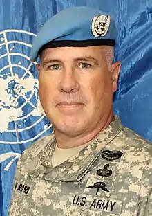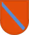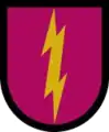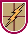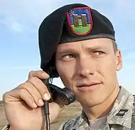 In the United States (US) armed forces of today, a beret flash is a shield-shaped embroidered cloth or large polished metallic insignia that is usually attached to a stiffener backing of a military beret. The attached beret flash is worn over the left eye of the wearer with the excess cloth of the beret shaped, folded, and pulled over the right ear giving it a distinctive appearance.[1][2] The embroidered designs of the Army's beret flashes represent the distinctive heraldic colors and patterns of units with unique missions or represent the Army overall while the Air Force's represent their Air Force Specialty Code (AFSC) or their assignment to a unit with a unique mission.[2][3] Joint beret flashes, such as the United Nations Beret Flash—attached to the United Nations Peacekeepers ligh-blue beret—the Multinational Force and Observers Beret Flash—attached to a terracotta-colored beret—and the Joint Communications Support Element Beret Flash—attached to a maroon beret—are worn by all or most of the US armed forces while assigned to a specific joint units.[4][5][6]