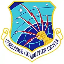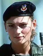 In 1957, the Strategic Air Command (CMD) Elite Guard was the first Air Force unit authorized to wear berets. The first beret flash worn on the unit's navy-blue beret was a metal full-color replica of the Strategic Air CMD Shield.[60][61] In 1966/67, the newly formed 1041st Security Police SQN was authorized to wear a different shade of dark-blue beret and used a depiction of a falcon carrying a pair of lightning bolts on a light-blue cloth patch as their beret flash.[62][59][63] In 1976, the Air Force approved the navy-blue beret, worn by Strategic Air CMD's Elite Guard and Air Force Combat Control Teams, as the official uniform item for all Air Force police and security forces.[62][64] The beret flash used on these berets was a metal full-color replica of the airman's major CMD shield.[65][58] In 1997, the Air Force stood up the security forces AFSC and honored the heraldry of the 1041st Security Police SQN by creating a new cloth beret flash for all security forces airman and NCOs that depict the 1041st's falcon over an airfield with the motto "Defensor Fortis" (defenders of the force) embroidered on a scroll at its base.[2][62] Security forces officers wear the same basic beret flash minus the embroidered falcon and airfield and in its place attach their polished metal rank insignia.[2]