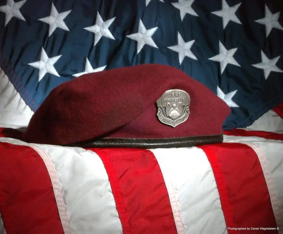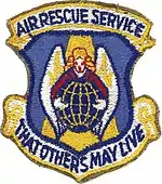 In 1966, Air Force pararescuemen, also known as a Pararescue Jumper (PJ), were authorized to wear the maroon beret and a large metallic Pararescue Beret Flash.[68][75] The color of the beret (maroon) was chosen to symbolize the sacrifice required of PJs and its initial wear followed the trend of the time whereby PJs used their Parachutist Badge as their beret flash due to perceived gaps in production and distribution of the Pararescue Beret Flash.[16][75][68][76] The Pararescue Beret Flash was derived from the Air Rescue Service shield—which was designed by TSgt Bill Steffens (Retired)[77]—and consists of a guardian angel wrapping its arms around the Earth, which symbolizes the mission of the PJ, surrounded by a parachute mounted on a banner that has the phrase, "That others may live," embossed on it, the PJ creed.[78] Combat rescue officers wear a modified version of the Pararescue Beret Flash with the word "Pararescue" replace with "Combat Rescue Officer" and is worn just above their miniature polished metal rank insignia on the same maroon beret as the PJs.[2][74]
