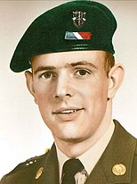 ![]() A medical corps paratrooper with the 11th Special Forces Group wearing green beret with 1st Special Forces DUI above his unit's recognition bar, c. 1967[26] |