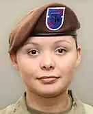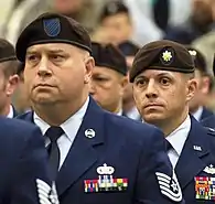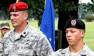 With the exception of joint beret flashes and some one-off wear requirements, Army soldiers and Non-Commissioned Officers (NCOs) attach their Distinctive Unit Insignia (DUI) to the beret flash.[1] Army warrant officers and commissioned officers attach their polished metal rank insignia to their beret flash while chaplains attach their polished metal branch insignia.[1] Air Force commissioned officers in the Security Forces or assigned to a Combat Aviation Advisor (CAA) squadron (SQN) wear their beret flash in the same manner as the Army.[2][7] Other Air Force commissioned officers in the Tactical Air Control Party (TACP) AFSC and those authorized large metallic beret flashes attach a miniature version of their polished metal rank insignia below their beret flash or crest.[2] Air Force airman and NCOs only wear their large metallic beret flash, cloth beret flash, or cloth beret flash with crest on AFSC or unit specific berets.[2][7]