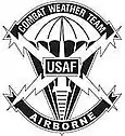 In the mid 1960s, Air Force commando weathermen,[79] formally known as weather parachutists, with Detachment 26 of the 30th Weather SQN and Detachment 32 of the 5th Weather SQN informally wore black berets.[80] The beret flash worn on these berets was a black cloth rectangle with a depiction of a yellow embroidered anemometer surmounted by a fleur-de-lis with the words “Combat Weather” split by the anemometer.[80] In 1963, weather parachutists from Detachment 75 of the 2nd Weather Group wore gray berets and like the PJs and combat controllers of the era used their Parachutist Badge as their beret flash and worn their polished metal rank insignia (enlisted, NCO, and officer alike) just below their badge.[67][75][80] From 1970 through the 1980s, weather parachutists with the 5th Weather SQN wore maroon berets with an Army style beret flash that incorporated the SQN's colors from their emblem's alchemical symbol for water—the green, blue, and red colors representing Earth, air, and fire respectively—and wore their Parachutist Badge attached to the flash.[41][80] In 1979, weather parachutists, now called Special Operations Weather Teams (SOWTs), were authorized to wear navy-blue berets with an Army style beret flash consisting of a blue and black field surrounded by yellow piping.[41][80] Enlisted and NCOs wore their Parachutist Badge attached to the flash while officers wore their polished metal rank insignia.[80] In 1986, the gray beret was authorized for wear by all SOWTs who continued to wear the aforementioned cloth beret flash until a new large color metallic SOWT Beret Flash was authorized.[80] This large metallic beret flash used the same color field as the previous cloth beret flash but had a parachute with the letters "USAF," a dagger, and crossed lightning bolts centered on the field with a scroll at the bottom embossed with the words “Air Weather Service;” this metal beret flash was surrounded by a gilded band embossed with the words “Special Operations Weather Team."[80] In 1992, the Air Force approved the return of the SOWT's blue, black, and yellow cloth beret flash from the 70s and used their color metallic SOWT Beret Flash from the 80's as their beret crest (i.e. it was placed on top of the cloth beret flash).[80] In 1996, the SOWTs assigned to the US Air Force Special Operations CMD (AFSOC) wore a new Army style beret flash while those assigned to Air Combat CMD, known as Combat Weather Teams (CWTs), continued to wear the original blue, black and yellow beret flash.[41][80][81] The AFSOC SOWT Beret Flash consisted of a red border representing the blood shed by their predecessors, a black background represented special operations, and three diagonal lines of various colors representing the services they supported (green=Army, purple=joint forces, and blue=Air Force).[80] Enlisted and NCOs wore their Parachutist Badge on top of the AFSOC SOWT Beret Flash while officers wore their polished metal rank insignia until 2002 when the Combat Weather Team Crest was created.[80] The Combat Weather Team Crest incorporated the center elements of the 1986 metallic SOWT Beret Flash/Crest—specifically the parachute, crossed lightning bolts, and dagger—with arched banners embossed with "Combat Weather Team" above, "Airborne" below, and "USAF" in a center rectangular banner.[80] The Combat Weather Team Crest was worn attached on both SOWT and CWT Beret Flashes by enlisted and NCOs while officers continued to wear their polished metal rank insignia.[80][82][83] In 2007/2008, the AFSOC SOWT Beret Flash stopped being worn and the Combat Weather Team Crest became the de facto beret flash for these units.[80][82][84] In 2009—when the Special Operations Weather AFSC was established—a new large polished metallic Special Operations Weather Beret Flash was approved for wear by all SOWTs and CWTs (enlisted, NCOs, and officers alike) but took an additional year to create and was worn in the same manner as the modern-day Combat Control and Pararescue Beret Flashes.[2][80][84][85] In 2019, SOWTs were re-designated special reconnaissance so the name embossed on the Special Operations Weather Beret Flash was changed to "SPECIAL U.S.A.F. RECON" and the fleur-de-lis was removed, otherwise this last variant of the SOWT's beret flash remains the same.[86][87]