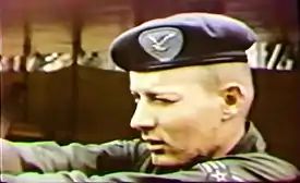 ![]() A Combat Control NCO with the 7th Aerial Port SQN wearing navy-blue beret with his Senior Parachutist Badge and rank insignia, 1964[66] |