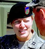 Throughout its history, Army soldiers and their units have adopted different headgear and headgear devices—such as color accoutrements, insignias, and flashes—signifying special capabilities and unique roles of soldiers and their units.[9][10] An example of this tradition started in World War II with the adoption of airborne insignias which were authorized for wear by military parachutists and glider-born forces on specific assignments and by those assigned to airborne units.[11][12] The airborne insignias were worn on the left-side front (for enlisted and NCOs) or right-side front (for officers) of the former Army service uniform's service cap.[11][12] Different variants of airborne insignias were worn until later in World War II when parachute and glider formations combined their unit-specific insignias into one red, white, and blue Airborne Insignia.[13] Although airborne units began to wear the maroon beret as their official headgear in the 1980s, the service cap with Airborne Insignia continued to be authorized for wear until the black beret became the standard Army headgear in 2000.[12][14][15]