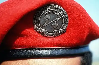 Historical photographs from 1964 through the 1970s show combat controllers wearing navy–blue berets.[66][67] Initial wear of these berets followed the trend of special forces units whereby combat controller's wore their Parachutist Badge over their left eye acting as their beret flash with officers wearing their polished metal rank insignia below their badge; yet other combat controllers wore these berets with their Parachutists Badge and polished metal rank insignia (enlisted, NCO, and officer alike) over their right temple with the excess of the beret's material pulled over the left hear.[16][66][67] The navy-blue beret was officially approved for wear by combat controllers in 1973.[68] In 1978 they received authorization to wear scarlet berets with a large metallic Combat Control Beret Flash, created by retired combat controllers Jack Hughes and Gene Adcock.[64][69] The combat controllers first beret flash was an unpolished metal circular disc surrounded by a wreath with a scroll at its base with the embossed words "Combat Control Team" and a lightning built diagonally splitting the center of the disc with a compass rose on the bottom-right half and a parachute on the upper-left half toped with the embossed phrase "First There."[69][70] The new scarlet beret and beret flash were worn in the same manner as it is today with the flash centered over the left eye and the excess cloth of the beret pulled over the right ear.[2][64][71] In 1984 the shape of the Combat Control Beret Flash was modified with some of its elements rearranged, a gridded globe added to its center, and the scroll changed to read "U.S.A.F. Combat Control; this new polished metal version is what the Combat Controllers wear today.[69][72] Special tactics officers also wear the scarlet beret and wear their miniature polished metal rank insignia just below a visually similar beret flash to the combat controllers but contains different symbols and phrases representing the different AFSCs they oversee and support: a compass rose for combat control, a guardian angel protecting the Earth for pararescue, a dagger with crossed lightning bolts for special reconnaissance, and a falcon for security forces all depicted in-front of a gridded globe flanked by wreaths with a scroll at its base with the phrases "USAF Special Tactics" and "Mal Ad Os" (bad to the bone) as well as a banner atop of the flash that contains the phrases "First There" and "That Others May Live."[2][73][74]