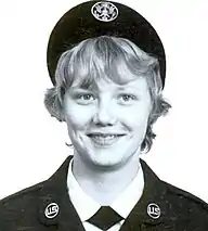 Starting in the 1970s, a special female beret was authorized for wear as alternate headgear for the Army, Air Force, Navy, and Marine Corps with various service uniforms.[10][112][113] The Navy was the last service to remove the female beret from their uniform regulations in 2015.[115] These black (Army and Navy), dark-blue (Air Force), and dark-green (Marine Corps) female berets were of similar design and worn on the crown of the head.[10][112][113][116] These service members wore their traditional cap devices on these female berets but unlike today's Army and Air Force beret flashes, these devices were worn center-forward on the beret with the exception being the Navy who wore their devices centered over the left eye.[10][112][113][116]