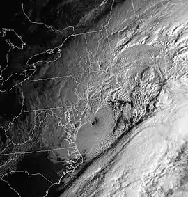 Coastal extratropical cyclones, known as nor'easters, bring a bulk of the wintry precipitation to the region during the cold season as they track parallel to the coastline, forming along the natural temperature gradient of the Gulf stream before moving up the coastline.[61] The Appalachian Mountains largely shield New York City and Philadelphia from picking up any lake-effect snow, though ocean-effect snows are possible near Cape Cod.[62] The Finger Lakes of New York are long enough for lake-effect precipitation. Lake-effect snow from the Finger Lakes occurs in upstate New York until those lakes freeze over.[63] Bay-effect snows fall downwind of Delaware Bay, Chesapeake Bay, and Massachusetts Bay when the basic criteria are met. Ocean effect snows are possible downwind of the Gulf Stream across the Southeast.[64]