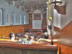 During World War II, Ezio Franceschini, who supported the Resistance, organized meetings of the Freedom Volunteer Corps (coordination structure of the partisans) in the university. Towards the end of the war, in 1944, the professor of medieval Latin letters hid, in the basement of Cattolica, a box containing documents and books on the Resistance and FRAMA group founded by Ezio Franceschini. The SS rummaged everywhere in UCSC to find those cards but, buried among the bones of fifty skeletons dead from an epidemic of plague in the sixteenth century, they remained there and emerged only after the war.[9]