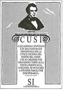 Carlo Speziali, then Councilor of State, was the main promoter of CUSI. However, although a bill about CUSI was passed by the Grand Council on 11 December 1985, a committee led by Augusto Bolla and UDC deputy Giovanni Maria Staffieri launched a referendum against it.[20] The committee formed in favor of CUSI drew on the earlier legacy of Franscini, to demonstrate the historical necessity of higher-education in Ticino.[19]