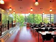 The "Aule" building, informally known as Palazzo Rosso ("Red Building"), hosts six classrooms on each of its three floors, and is commonly used for Economics and Communication Sciences courses. The modern-looking concrete and metal Informatics building finished in 2007 contains classrooms (1), offices and study areas reserved for CS students and mentors (2-3).