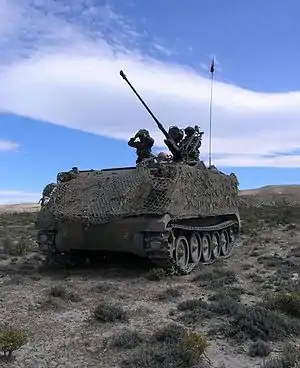 In 1967, the Argentine Army received from USA 250 M113A1 APC, 10 M577A1 command and control vehicles and 12 M548A1 cargo carriers. In 1992, they received from USA 200 M113A2 APC, 25 M106A1 mortar carrier, 10 M577A1 command and control vehicles and 16 M548A1 cargo carriers. Some variants are modified by the Army's Comando de Arsenales.[2][3]